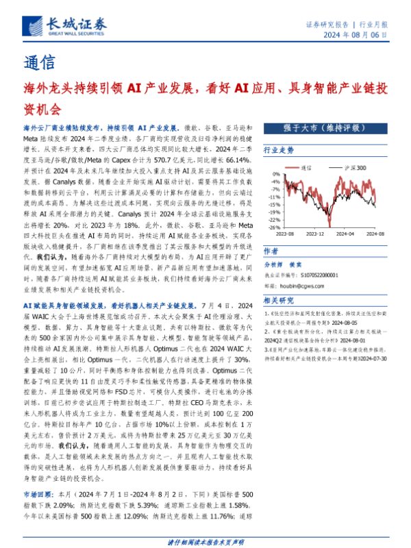 【长城证券】【20240806】通信行业月报:海外龙头持续引领AI产业发展,看好AI应用、具身智能产业链投资机会-18页 行业研究