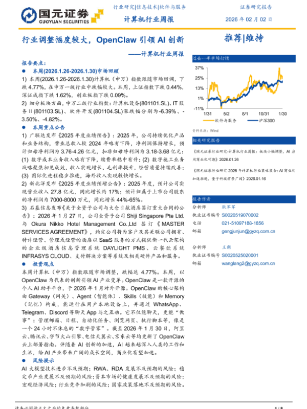【国元证券】【202601】计算机行业周报:行业调整幅度较大,OpenClaw引领AI创新-8页 证券期货研究报告