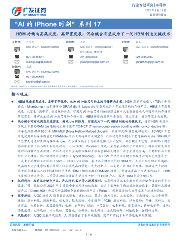 【广发证券】【20230813】HBM持续向高集成度、高带宽发展,混合键合有望成为下一代HBM制造关键技术-16页 行业研究