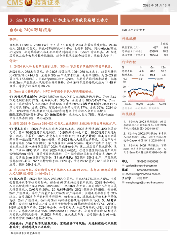 【海通证券】【20250116】电子行业台积电24Q4跟踪报告:3、5nm节点需求强劲,AI加速芯片贡献长期增长动力-11页 行业研究