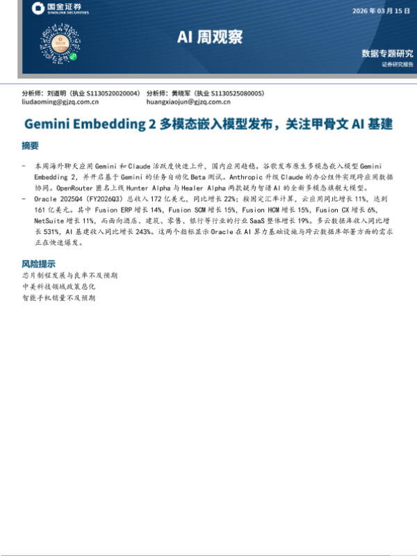 【国金证券】【202503】AI周观察:Gemini Embedding 2多模态嵌入模型发布,关注甲骨文AI基建-7页 证券期货研究报告