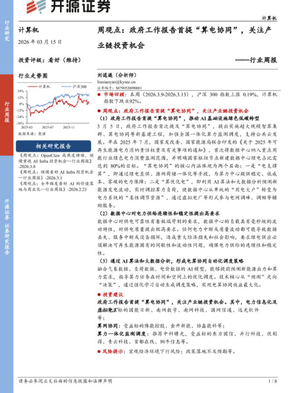 【开源证券】【202603】周观点:政府工作报告首提“算电协同”,关注产业链投资机会-8页 证券期货研究报告