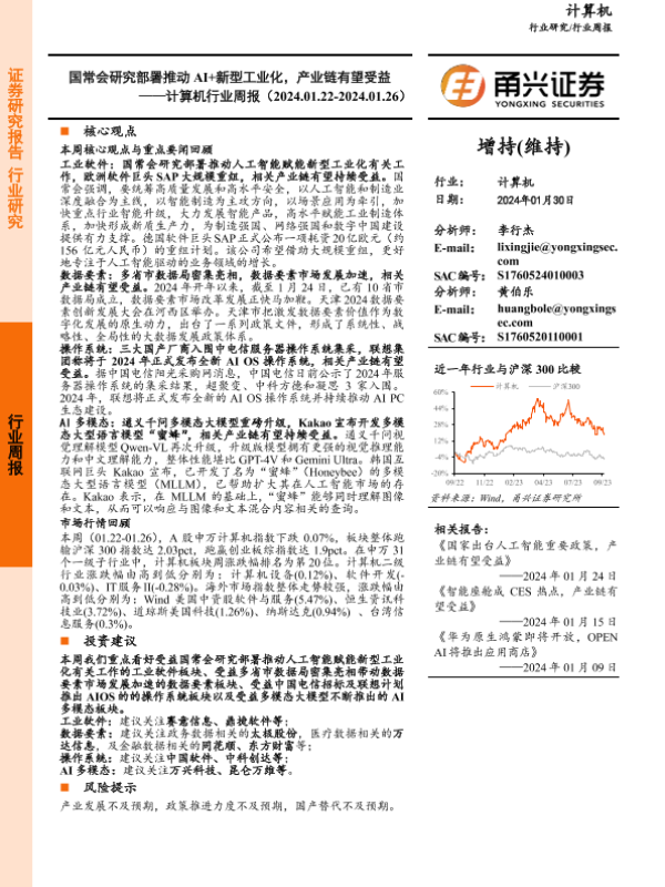 【甬兴证券】【20240130】国常会研究部署推动AI+新型工业化,产业链有望受益——计算机行业周报(2024.01.22-2024.01.26)-15页 行业研究