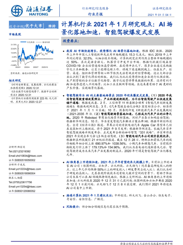 【海通证券】【20210104】计算机行业2021年1月研究观点:AI场景化落地加速,智能驾驶爆发式发展-6页 行业研究
