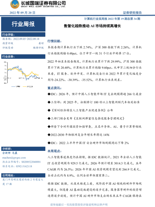 【长城国瑞证券】【20220920】计算机行业双周报2022年第19期总第34期:数智化趋势推动AI市场持续高增长-11页 行业研究