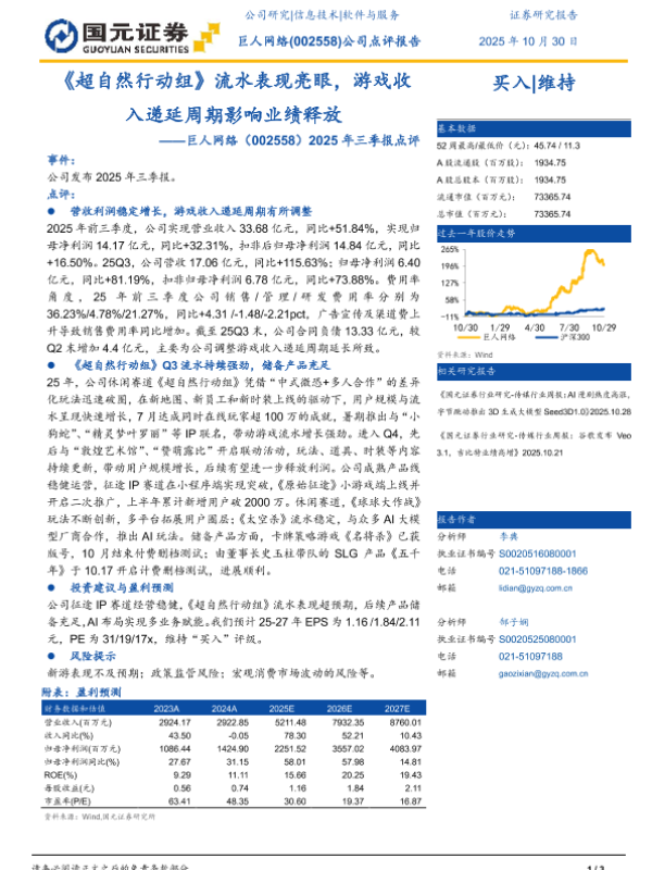 【国元证券】【202510】《超自然行动组》流水表现亮眼,游戏收入递延周期影响业绩释放——巨人网络(002558)2025年三季报点评-3页 证券期货研究报告