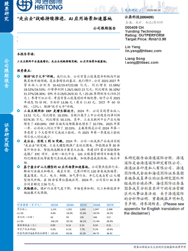 【海通国际】【20250626】云鼎科技(000409)公司跟踪报告:“走出去”战略持续推进,AI应用场景加速落地-11页 公司研究