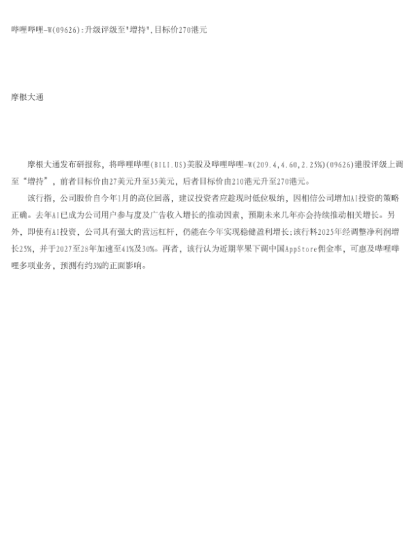 【J.P. Morgan】【2026】哔哩哔哩-W(09626) 升级评级至'增持',目标价270港元-1页 公司研究