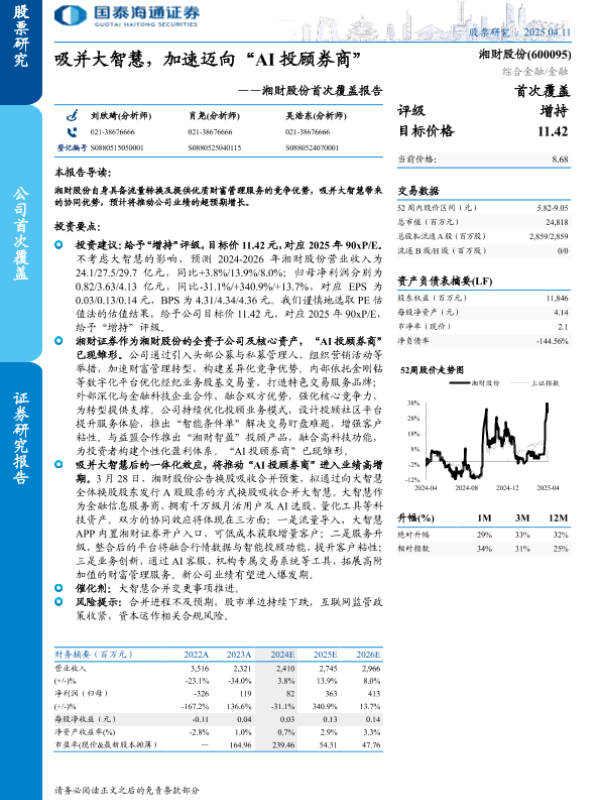 【国泰海通证券】【20250411】湘财股份首次覆盖报告:吸并大智慧,加速迈向“AI投顾券商”-13页 证券期货研究报告