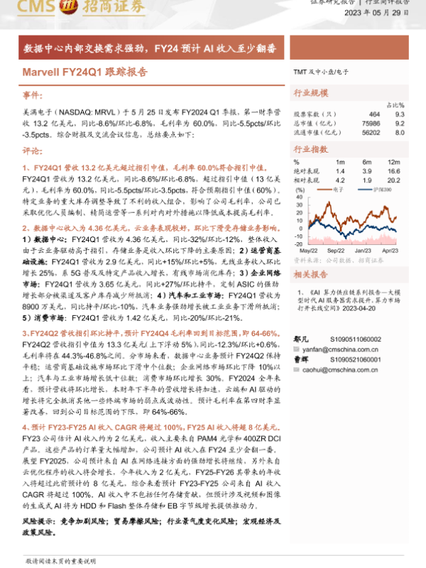 【海通证券】【20230529】Marvell FY24Q1跟踪报告-数据中心内部交换需求强劲,FY24预计AI收入至少翻番-13页 行业研究