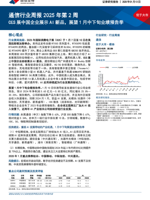 【国信证券】【20250113】通信行业周报2025年第2周:CES展中国企业展示AI新品,展望1月中下旬业绩预告季-20页 行业研究