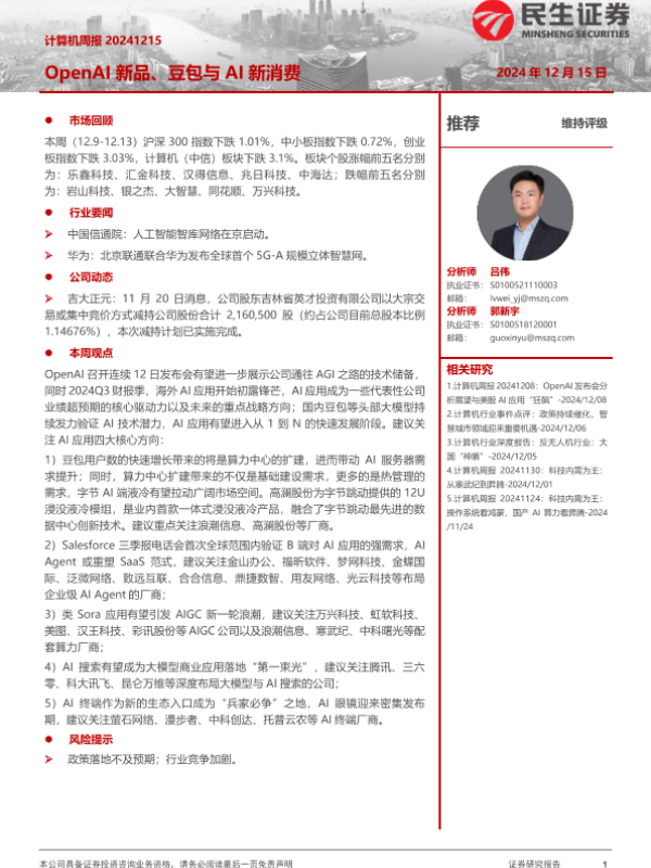【民生证券】【20241215】OpenAI新品、豆包与 AI新消费-20页 行业研究