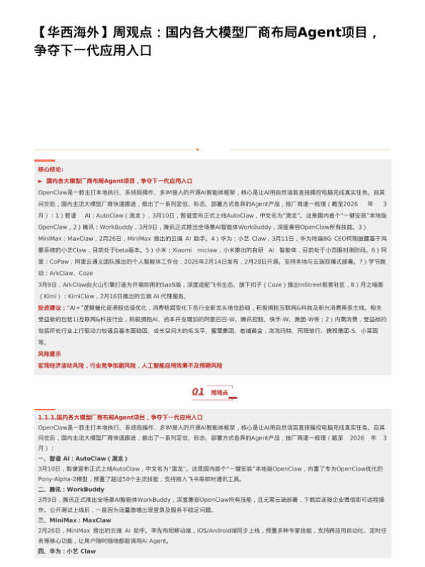 【华西证券】【202603】【华西海外】周观点:国内各大模型厂商布局Agent项目,争夺下一代应用入口-8页 证券期货研究报告