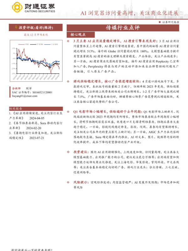 【财通证券】【202404】传媒行业点评:AI浏览器访问量高增,关注商业化进展-13页 行业研究