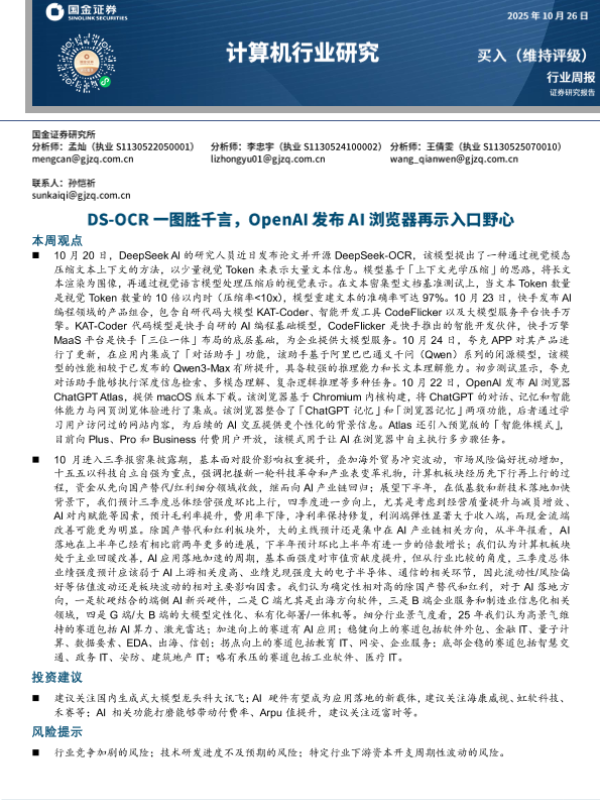【国金证券】【202510】计算机行业研究:DS-OCR一图胜千言,OpenAI发布AI浏览器再示入口野心-10页 证券期货研究报告
