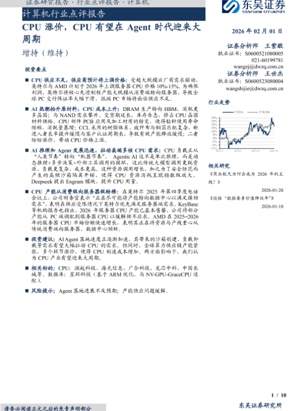 【东吴证券】【202602】CPU涨价,CPU有望在 Agent时代迎来大周期-10页 证券期货研究报告