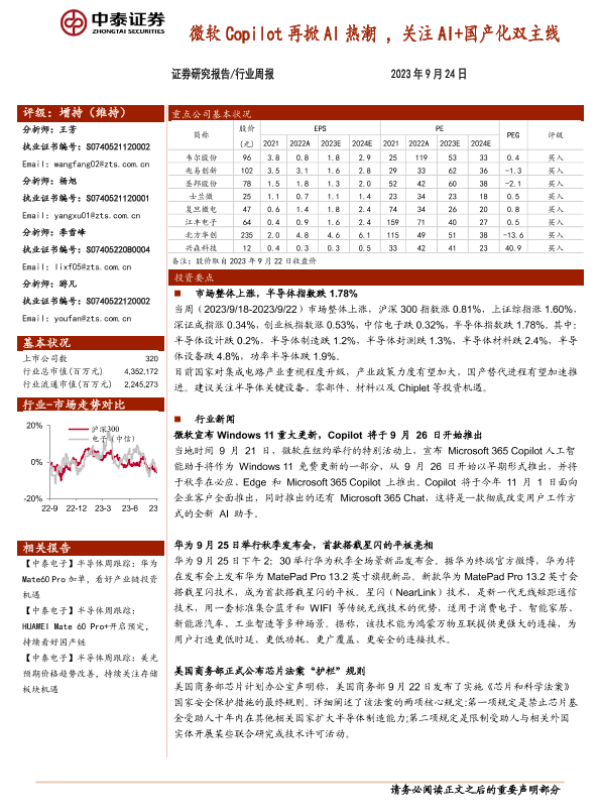 【中泰证券】【20230924】20230924-中泰证券-半导体行业周报:微软Copilot再掀AI热潮,关注AI+国产化双主线-13页 行业研究