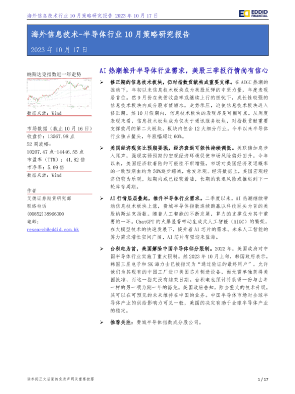 【艾德证券期货】【20231017】海外信息技术_半导体行业10月策略研究报告:AI热潮推升半导体行业需求,美股三季报行情尚有信心-17页 行业研究