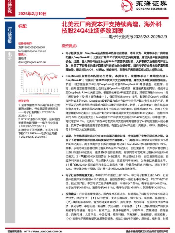 【东海证券】【20250210】20250210-东海证券-电子行业周报:北美云厂商资本开支持续高增,海外科技股24Q4业绩多数回暖-15页 行业研究