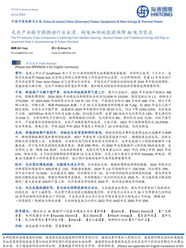 【海通国际】【20240726】中国电新与火电行业:光伏产业链亏损推动行业出清,核电和传统能源保障AI电力需求-10页 行业研究