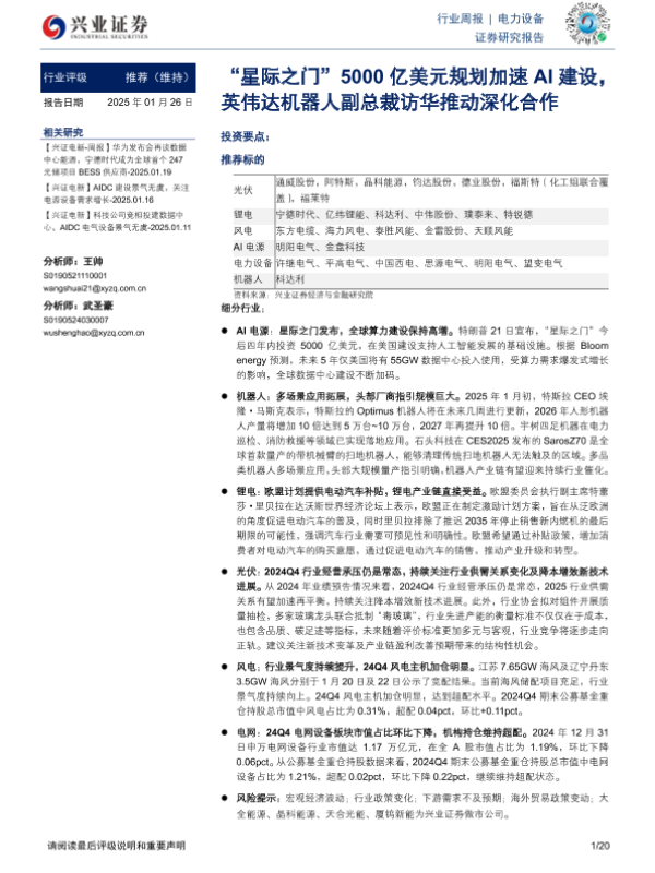 【兴业证券】【20250126】电力设备行业周报:“星际之门”5000亿美元规划加速AI建设,英伟达机器人副总裁访华推动深化合作-20页 行业研究