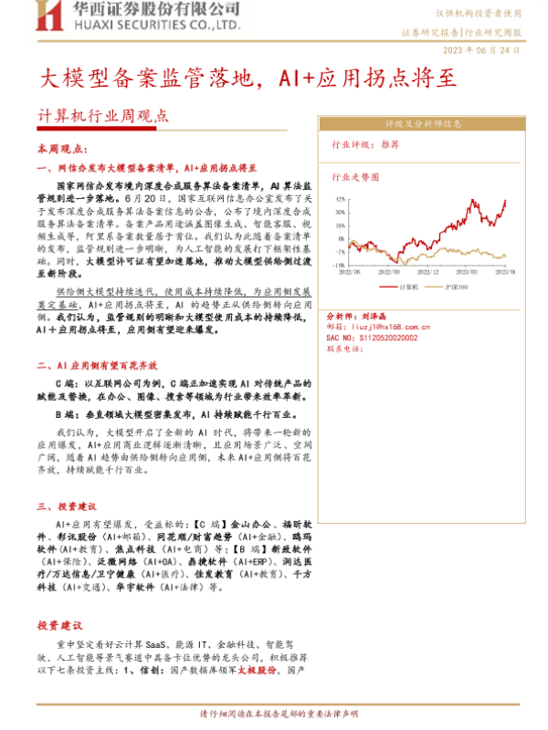 【华西证券】【20230624】计算机行业周观点:大模型备案监管落地,AI+应用拐点将至-25页 行业研究
