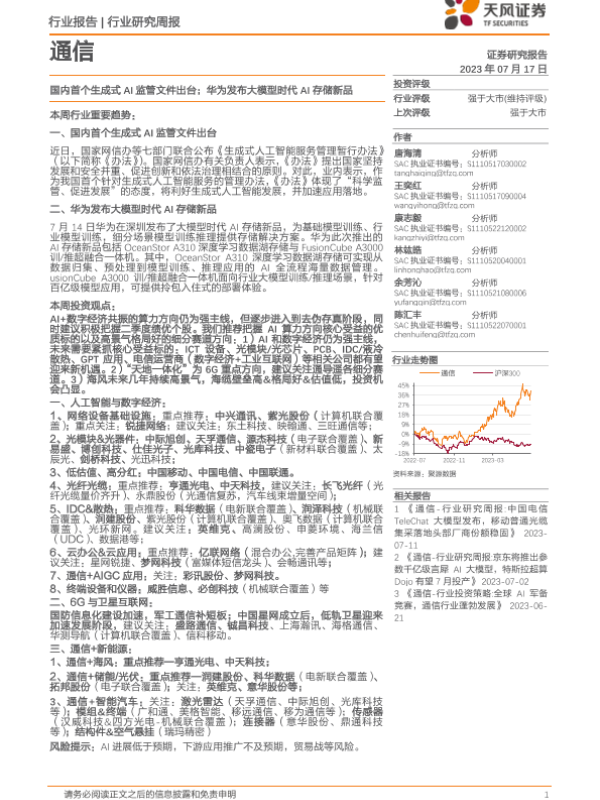 【天风证券】【20230717】20230717-天风证券-通信行业研究周报:国内首个生成式AI监管文件出台;华为发布大模型时代AI存储新品-12页 行业研究