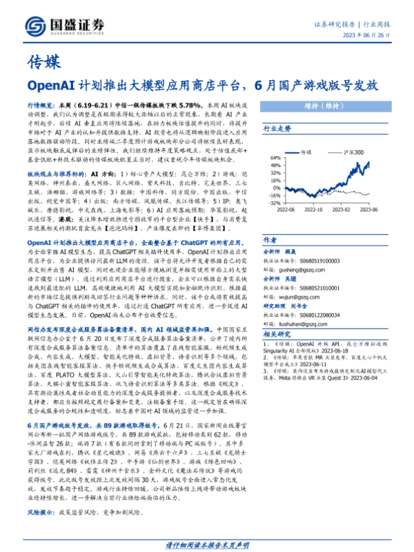 【国盛证券】【20230626】传媒行业周报:OpenAI计划推出大模型应用商店平台,6月国产游戏版号发放-10页 行业研究