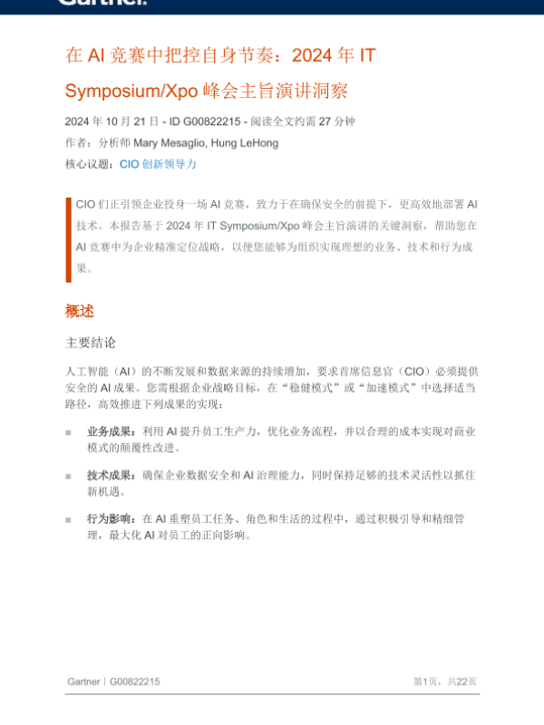 【Gartner】【20241021】在AI竞赛中把控自身节奏:2024年IT Symposium/Xpo峰会主旨演讲洞察-22页 行业研究