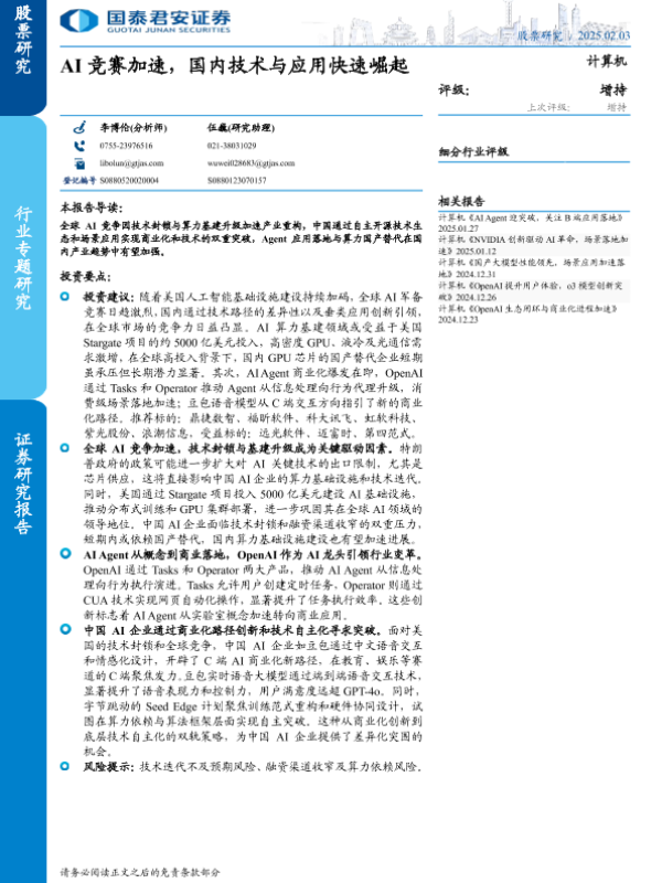 【国泰君安证券】【20250203】计算机行业:AI竞赛加速,国内技术与应用快速崛起-11页 行业研究