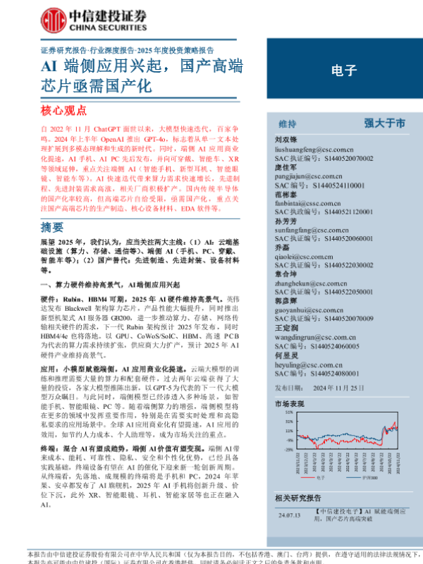 【中信建投证券】【20241125】2024年12月05日更新-【中信建投】电子行业深度报告·2025年度投资策略报告:AI端侧应用兴起,国产高端芯片亟需国产化-75页 行业研究