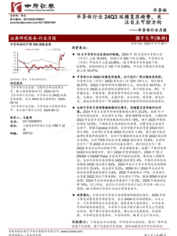【中原证券】【20241108】20241108-中原证券-半导体行业月报:半导体行业24Q3延续复苏趋势,关注自主可控方向-48页 行业研究
