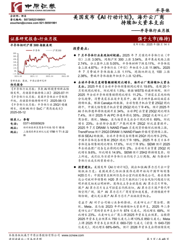 【中原证券】【202508】半导体行业月报:美国发布《AI行动计划》,海外云厂商持续加大资本支出-48页 证券期货研究报告