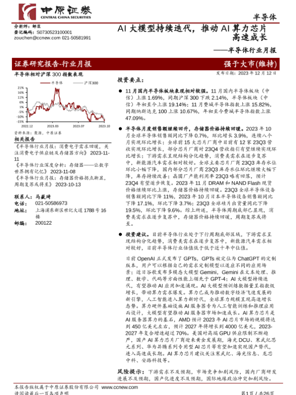 【中原证券】【20231212】半导体行业月报:AI大模型持续迭代,推动AI算力芯片高速成长-26页 行业研究