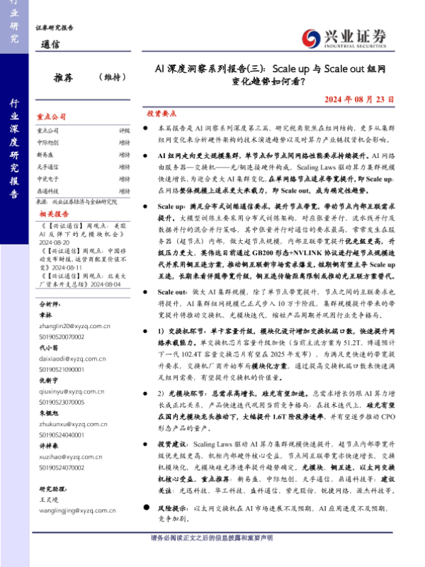 【兴业证券】【20240823】通信行业AI深度洞察系列报告(三):Scale up与Scale out组网变化趋势如何看?-24页 行业研究