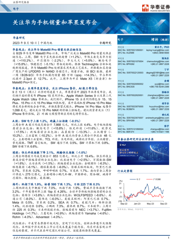 【华泰证券】【20230910】电子行业专题研究:关注华为手机销量和苹果发布会-46页 行业研究