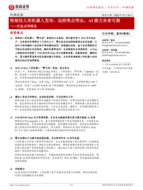【浙商证券】【20221004】20221004-浙商证券-机械设备行业点评报告:特斯拉人形机器人发布,运控亮点突出,AI能力未来可期-11页 行业研究