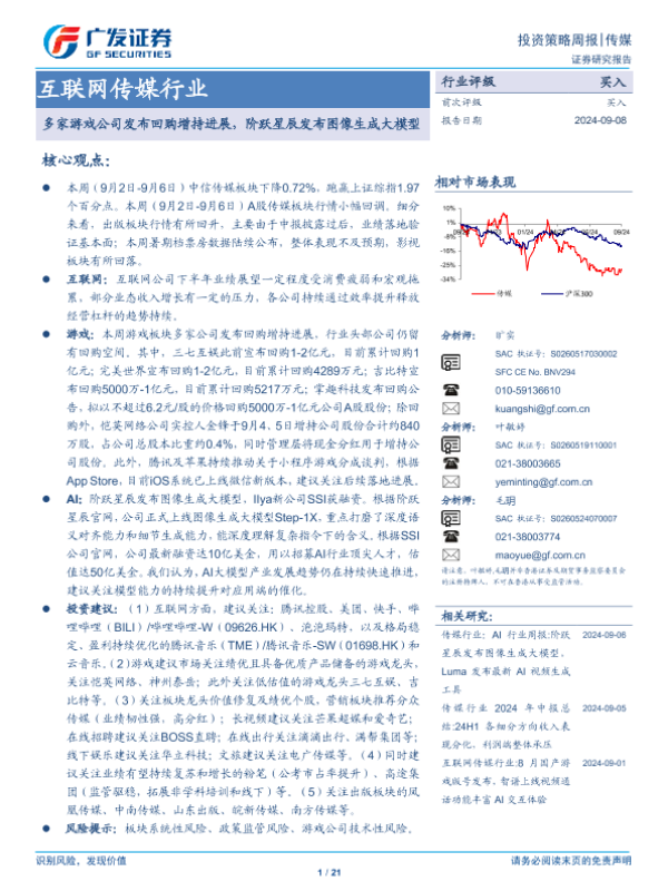 【广发证券】【20240908】互联网传媒行业:多家游戏公司发布回购增持进展,阶跃星辰发布图像生成大模型-21页 行业研究