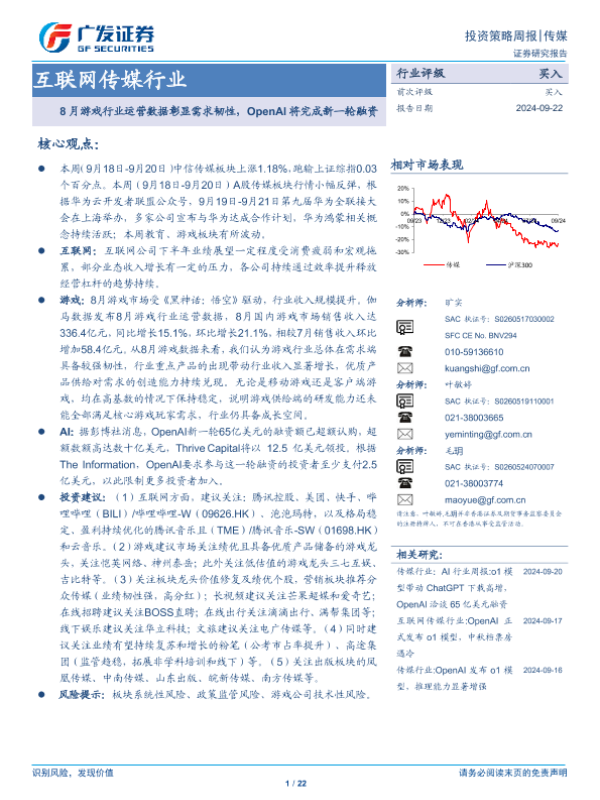 【广发证券】【20240922】互联网传媒行业:8月游戏行业运营数据彰显需求韧性,OpenAI将完成新一轮融资-22页 行业研究
