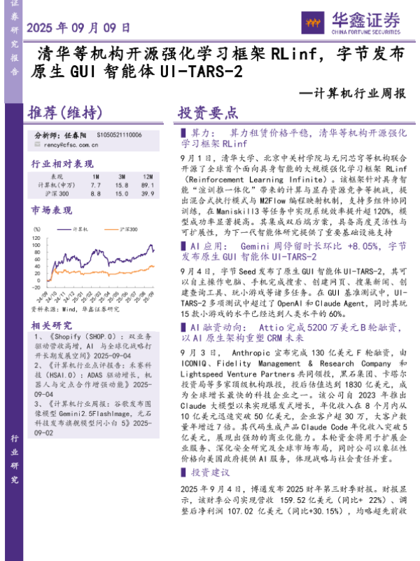【华鑫证券】【202509】清华等机构开源强化学习框架RLinf,字节发布原生GUI智能体UI-TARS-2-18页 证券期货研究报告