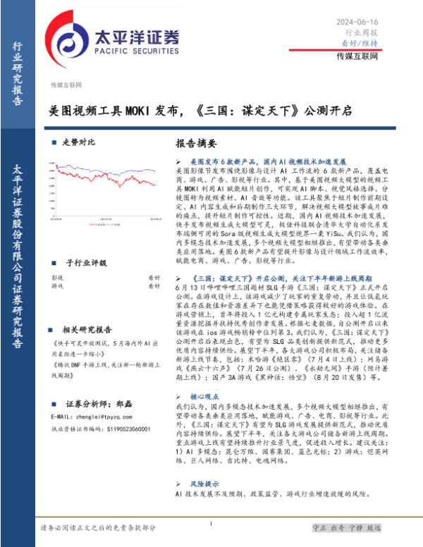 【太平洋证券】【20240616】传媒互联网行业周报:美图视频工具MOKI发布,《三国:谋定天下》公测开启-20页 行业研究
