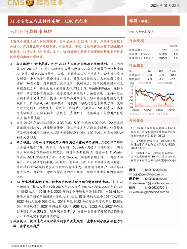 【海通证券】【20240522】传媒行业出门问问招股书梳理:AI语音交互行业持续高增,AIGC先行者-16页 行业研究