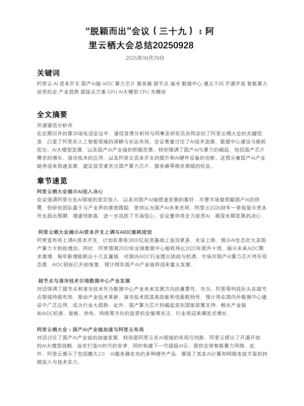 【开源通信分析师】【202509】阿里云栖大会总结20250928-4页 会议纪要