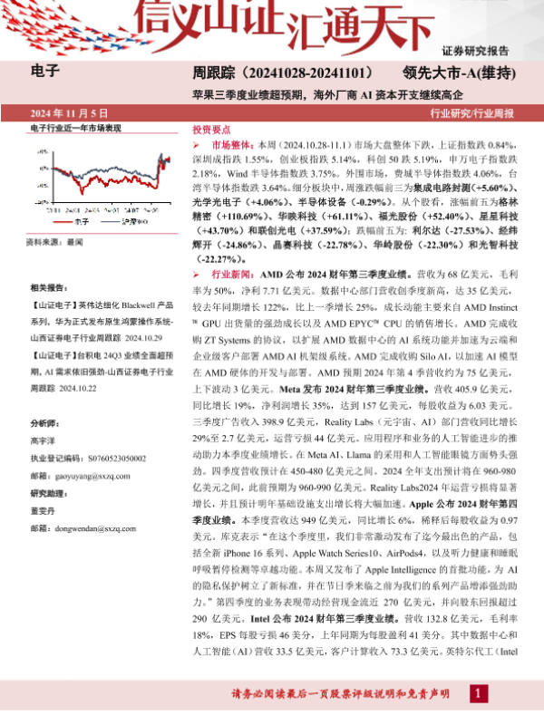 【山西证券】【20241105】电子行业周跟踪:苹果三季度业绩超预期,海外厂商AI资本开支继续高企-14页 行业研究