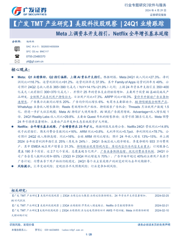 【广发证券】【20240429】美股科技股观察-24Q1业绩跟踪:Meta上调资本开支指引,Netflix全年增长基本延续-27页 行业研究