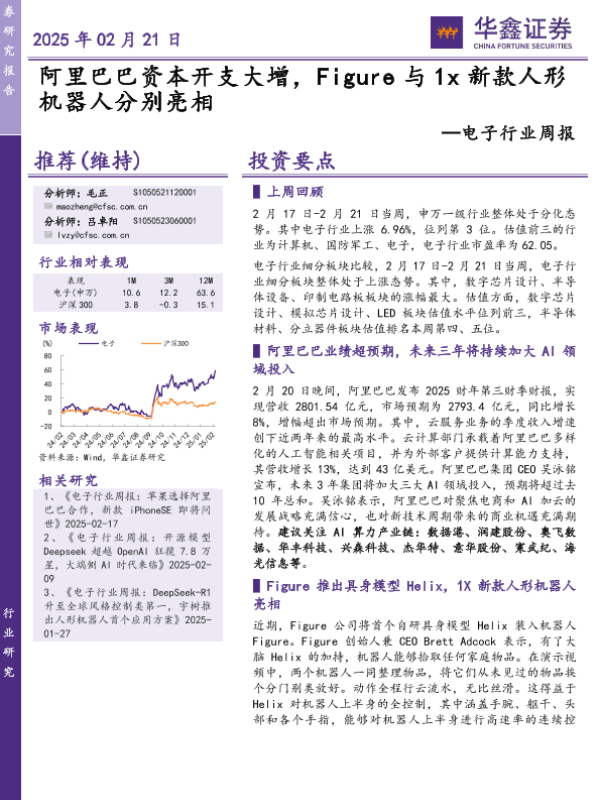 【华鑫证券】【20250221】电子行业周报:阿里巴巴资本开支大增,Figure与1x新款人形机器人分别亮相-53页 行业研究