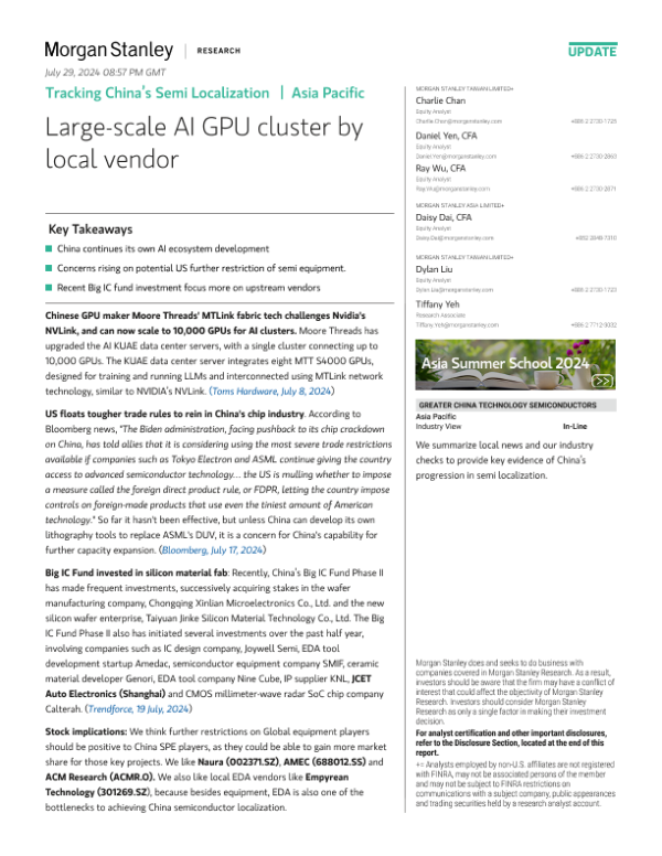 【Morgan Stanley】【20240726】Tracking China’s Semi Localization Large-scale AI GPU cluster-20页 行业研究