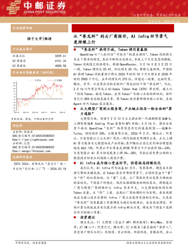 【中邮证券】【202603】从“养龙虾”到云厂商涨价,AI Infra环节景气度持续上行-4页 证券期货研究报告
