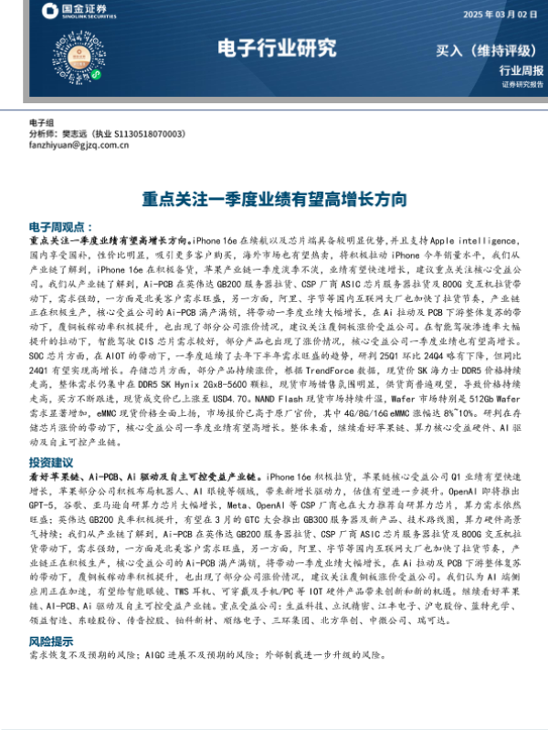 【国金证券】【20250302】电子行业研究:重点关注一季度业绩有望高增长方向-10页 行业研究