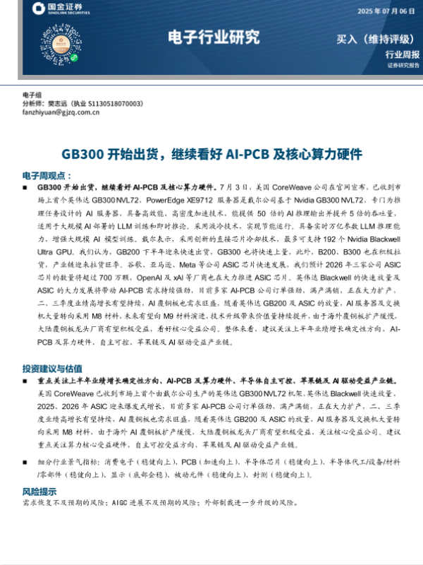 【国金证券】【20250706】电子行业研究:GB300开始出货,继续看好AI-PCB及核心算力硬件-10页 行业研究